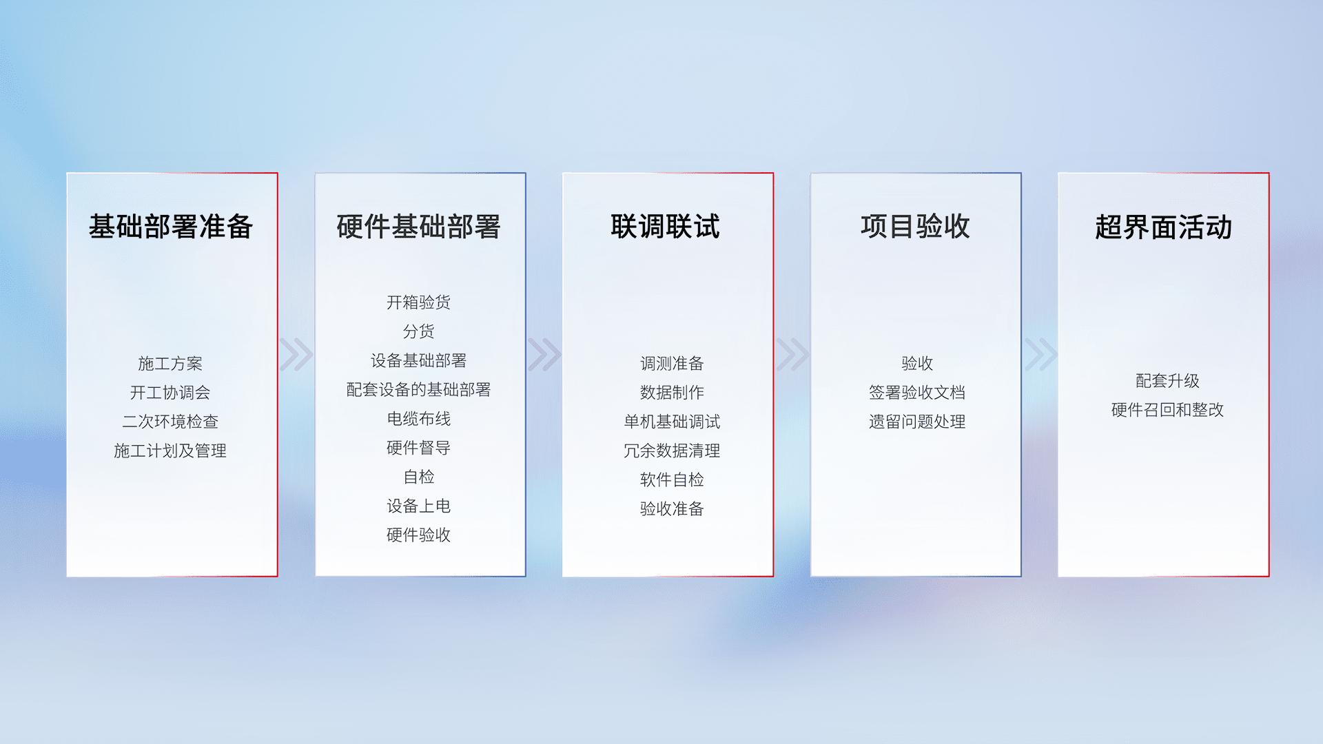 从基础部署准备、、硬件基础部署、、、、联调联试、、、项目验收、、、越界面活动的全过程可追溯,,,保证施工质量和进度。。